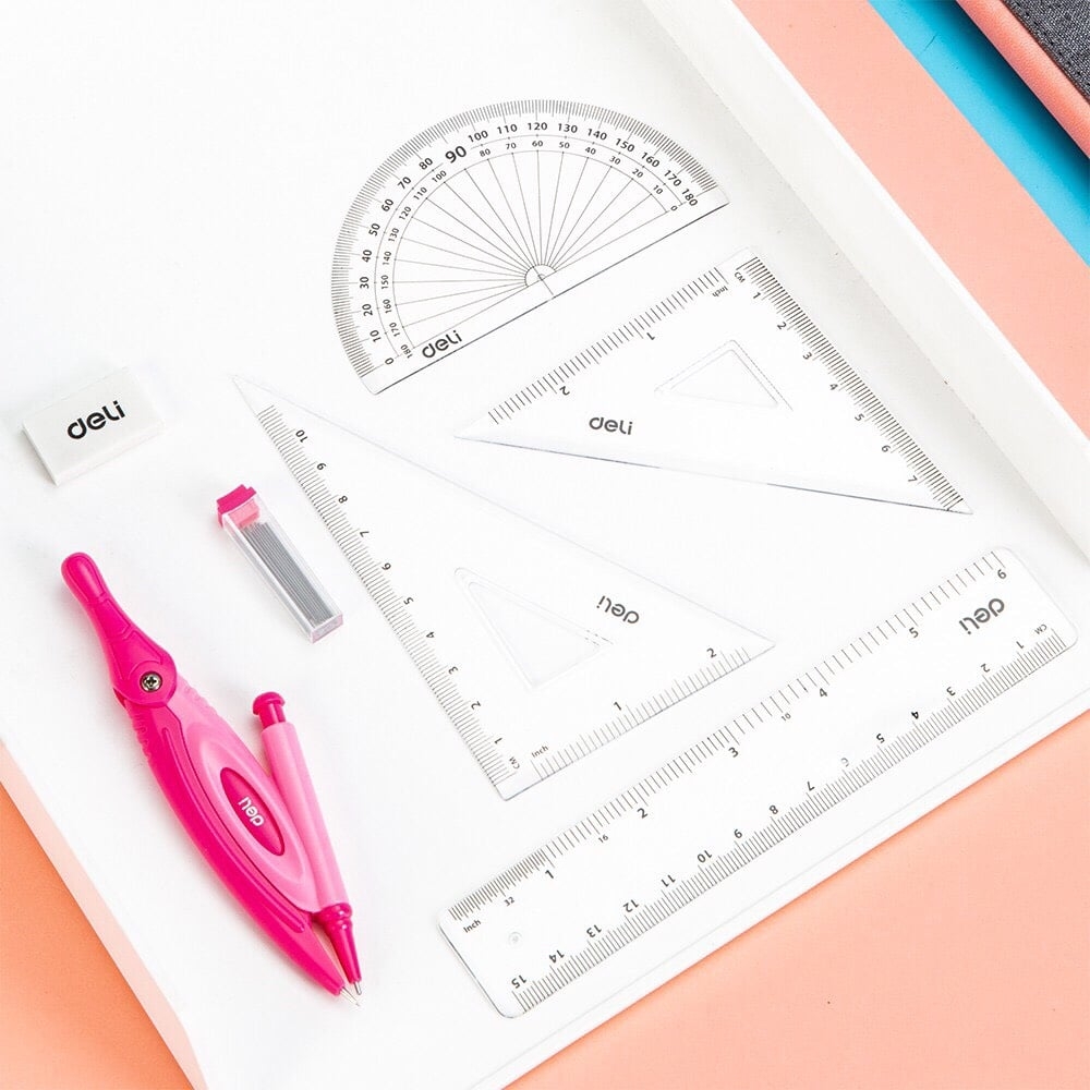 7 dụng cụ đa chức năng: Bộ Deli G30304 bao gồm 7 dụng cụ chất lượng, bao gồm compa, eke, thước kẻ, cây vẽ hình tròn, và các phụ kiện hỗ trợ khác. Tất cả đều được thiết kế để đáp ứng nhu cầu học tập và sáng tạo của bạn.